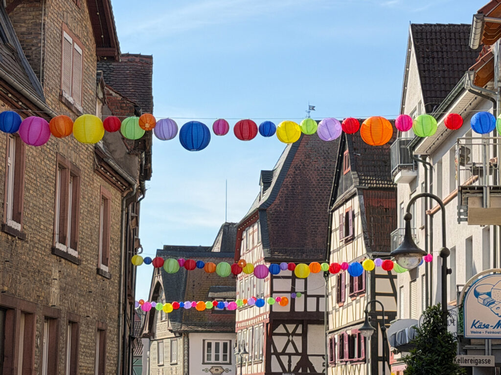 Bensheim | 21. April 2026 Die Bensheimer Innenstadt ist wieder ein Stück bunter geworden: In der Gerbergasse haben die Mitarbeiterinnen des Teams Stadtmarketing und Mitarbeitende des Bensheimer Bauhofs in den vergangenen Tagen erneut rund 150 farbenfrohe Lampions aufgehängt. Bereits vor zwei Jahren hatte die Aktion viele positive Rückmeldungen ausgelöst – nun sorgen die leuchtenden Farbtupfer erneut für eine besondere Atmosphäre im Herzen der Stadt.