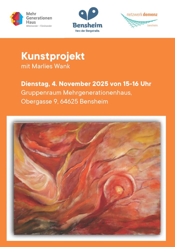 Das Kunstprojekt unter der Leitung der Künstlerin Marlies Wank wird für Menschen mit leichter bis mittelgradiger Demenz in Begleitung eines Angehörigen angeboten. Sollte der Angehörige verhindert sein, können ehrenamtliche Demenzlotsen den demenziell Erkrankten begleiten.