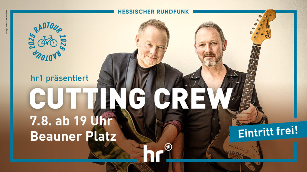 Ab 19 Uhr präsentiert hr1 die britische Rockband Cutting Crew, die mit Welt-Hits wie „(I Just) Died in Your Arms“, „I’ve Been in Love Before“ und „Any Colour“ in den 1980ern bekannt geworden ist. Sie überzeugen mit ihrem ausdrucksstarken Sound. Auf der Welcome-Party der hr Radtour feiern wir zu den schönen und zeitlosen Songs der Band.