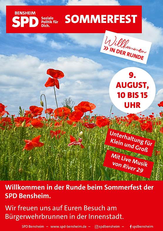 Die Bensheimer SPD veranstaltet am kommenden Samstag (9. August) ein Sommerfest. Zwischen 10:00 und 15:00 Uhr bieten die Sozialdemokraten am Bürgerwehrbrunnen in der Fußgängerzone Unterhaltung für Groß und Klein.